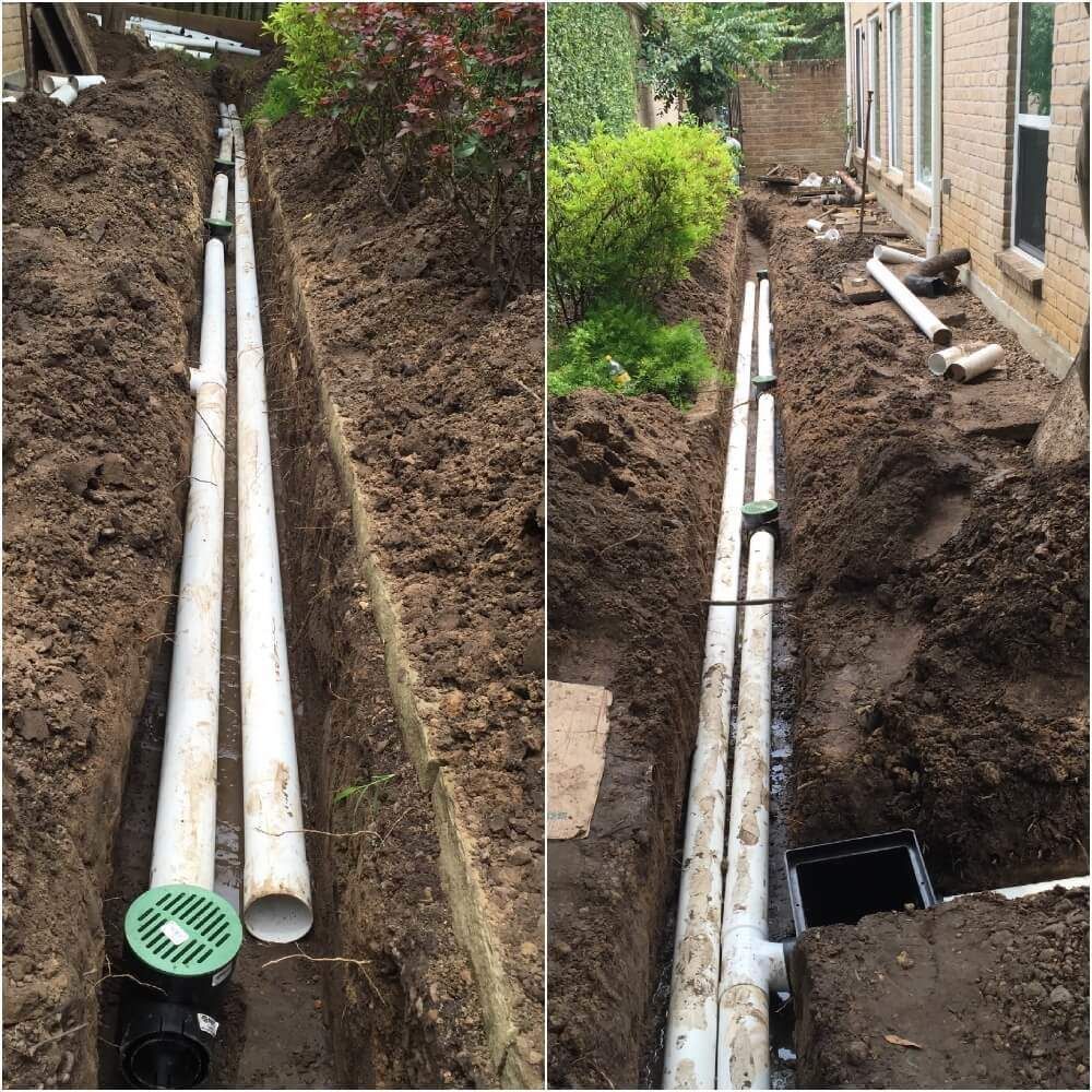 French Drains intersect with the rain gutters to detour the rain water away from foundations and carry the overflow water to the street, also French drains can alleviate standing water to drain to the street instead of causing standing water in your yard.